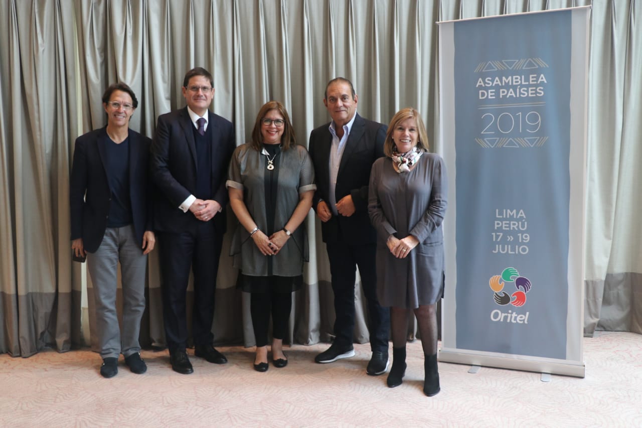 Conformación del Consejo Directivo de ORITEL tras el acto eleccionario en Lima (de izquierda a derecha): Fernando Landeros (México), Martín Fariña (Perú), Nilda Morales (Puerto Rico), Edwin Rivas (El Salvador) y Ximena Casarejos (Chile)